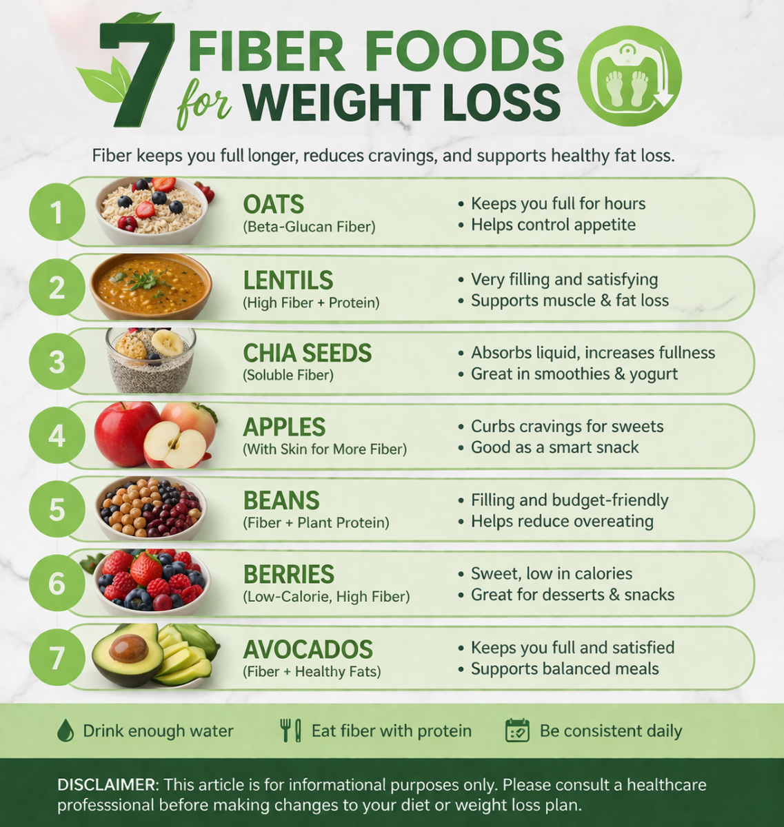 Knowing the 7 Fiber Foods for Weight Loss is helpful, but results come from using them consistently. You do not need to eat all seven foods every day. Instead, focus on building meals that include one or two fiber-rich ingredients at a time.