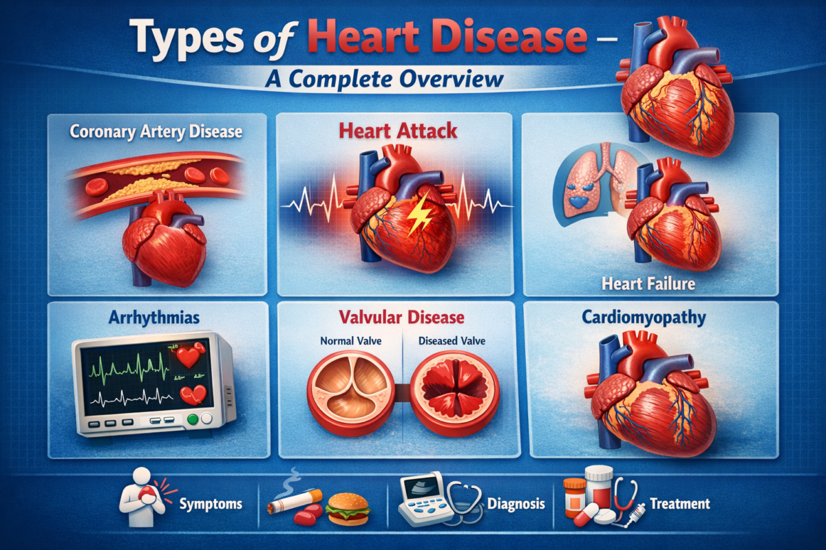 Types of Heart Disease – A Complete Overview Heart disease is a broad term used to describe various conditions that affect the heart’s structure and function. It includes problems such as coronary artery disease, heart attacks, heart failure, and irregular heartbeats. The main causes of heart disease are high blood pressure, high cholesterol, smoking, diabetes, obesity, and an unhealthy lifestyle. Early symptoms may include chest pain, shortness of breath, fatigue, and dizziness. Heart disease not only affects physical health but also impacts emotional well-being and family life. However, with proper medical care, healthy eating habits, regular exercise, stress management, and routine checkups, the risk of heart disease can be significantly reduced. Prevention and early diagnosis play a crucial role in maintaining long-term heart health.