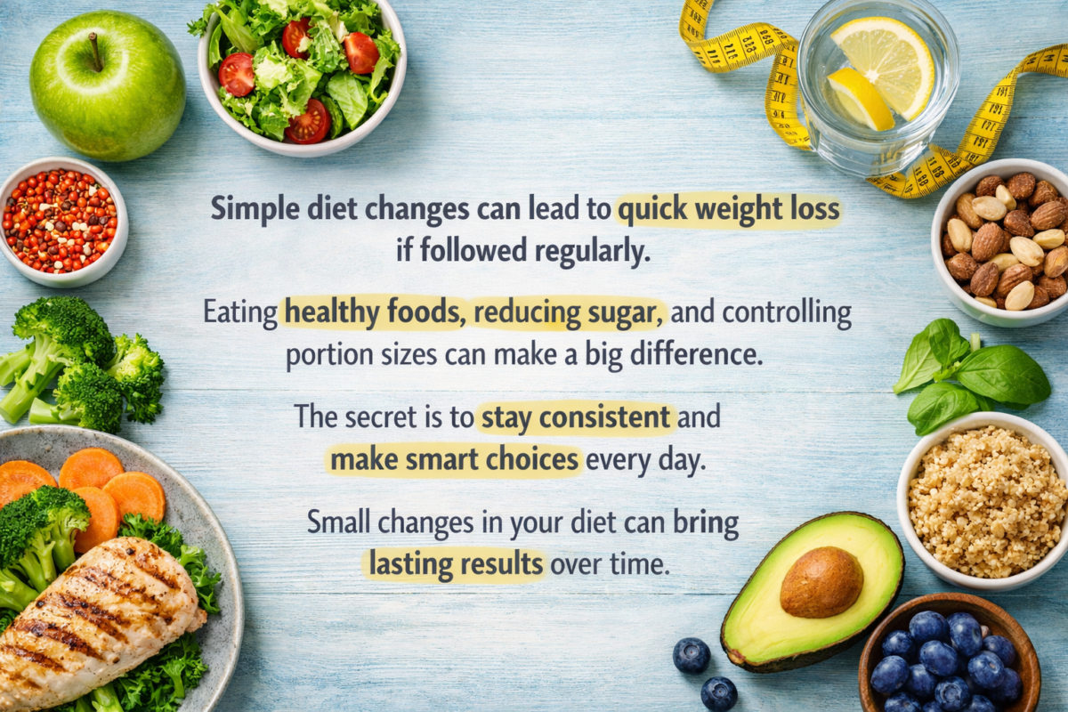 Simple diet changes can lead to quick weight loss if followed regularly. Eating healthy foods, reducing sugar, and controlling portion sizes can make a big difference. The secret is to stay consistent and make smart choices every day. Small changes in your diet can bring lasting results over time.